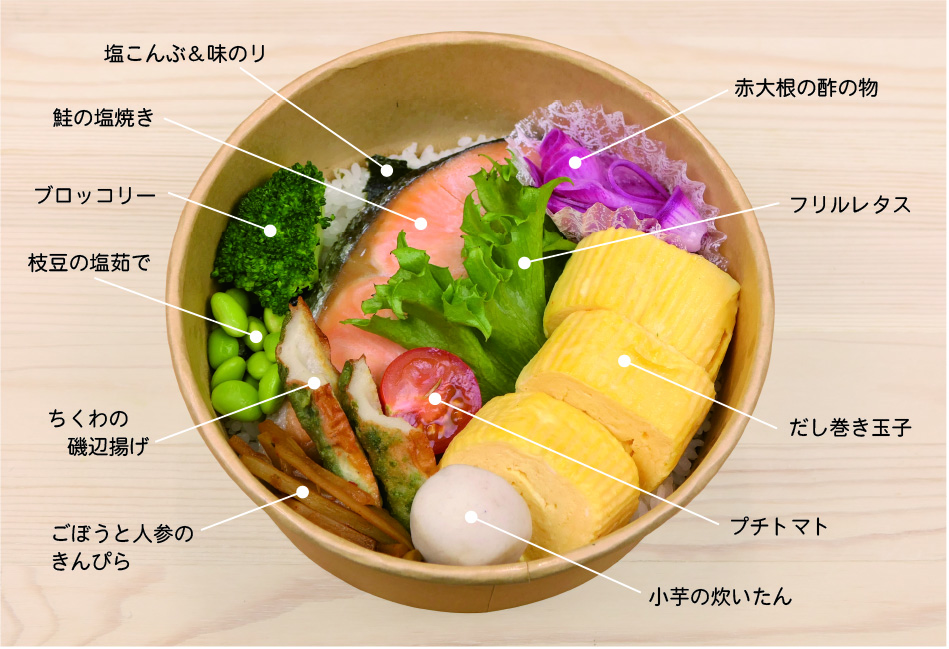 当店で人気のふわっふわのだし巻き玉子をメインに、鮭、野菜を取り入れたバランスのとれた納得のお弁当です