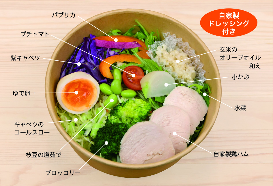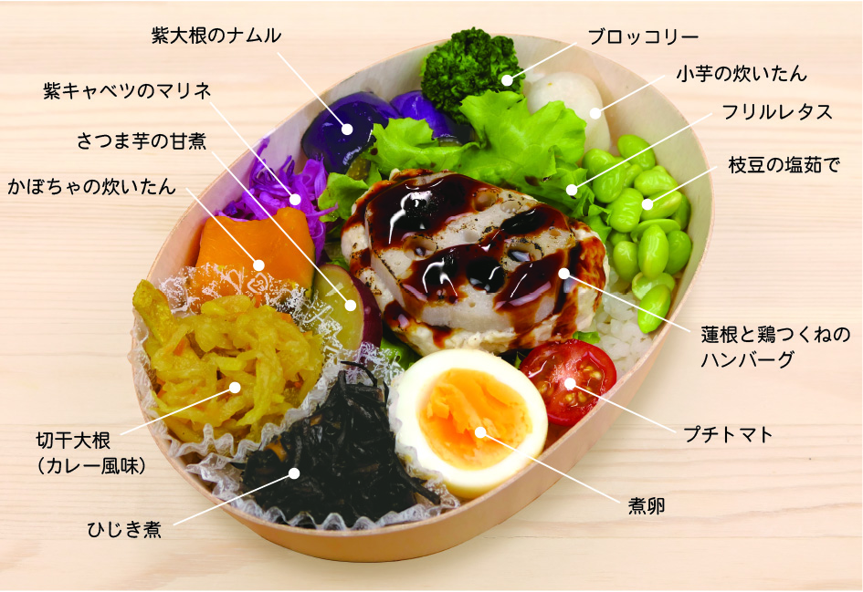 やさい・きっちんならではの野菜をふんだんに使ったお弁当です。塩麹で漬けて作る自家製の鶏ハムは柔らかくジューシーで玄米のオリーブオイル和えと相性バツグン!